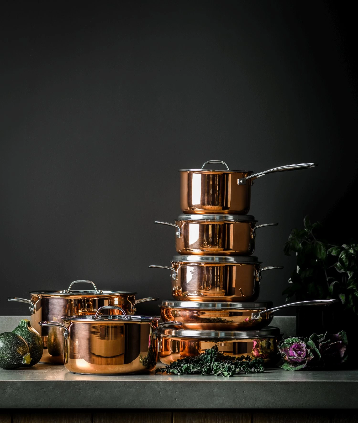 DUCQ pannen zijn niet alleen fraai in design maar ook van uitstekende kwaliteit. De pannen zijn opgebouwd uit 3 lagen: koper aan de buitenzijde, roestvrijstaal (RVS) aan de binnenzijde en een aluminium tussenlaag. Dit resulteert in een pan met voelbare kwaliteit (wanddikte 2,5 mm) en met een uitstekende warmteverdeling die gewaardeerd wordt door iedereen met een passie voor koken.